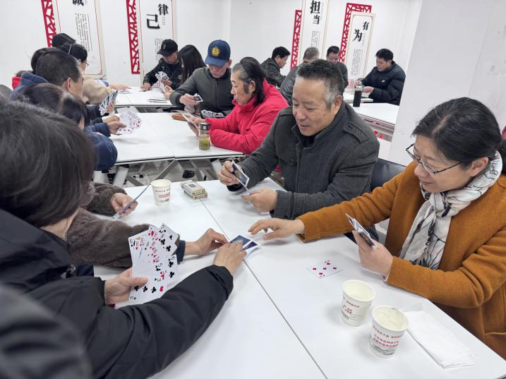 活動現(xiàn)場氣氛熱烈,社區(qū)內(nèi)眾多摜蛋愛好者齊聚一堂,以牌會友、切磋技藝。作為一項兼具趣味性、競技性與社交性的撲克游戲,摜蛋深受各年齡段居民的喜愛。比賽中,選手們時而凝神思索,時而默契配合,在輕松愉快的氛圍里展現(xiàn)著智慧與協(xié)作的魅力。這場比賽不僅是智力的較量,更是社區(qū)凝聚力的生動寫照。長干里社區(qū)新時代文明實踐站與社區(qū)文化站始終致力于開展形式多樣、內(nèi)容豐富的群眾文化活動,通過此類賽事進(jìn)一步推動社區(qū)文化建設(shè),增強(qiáng)居民的歸屬感與幸福感。